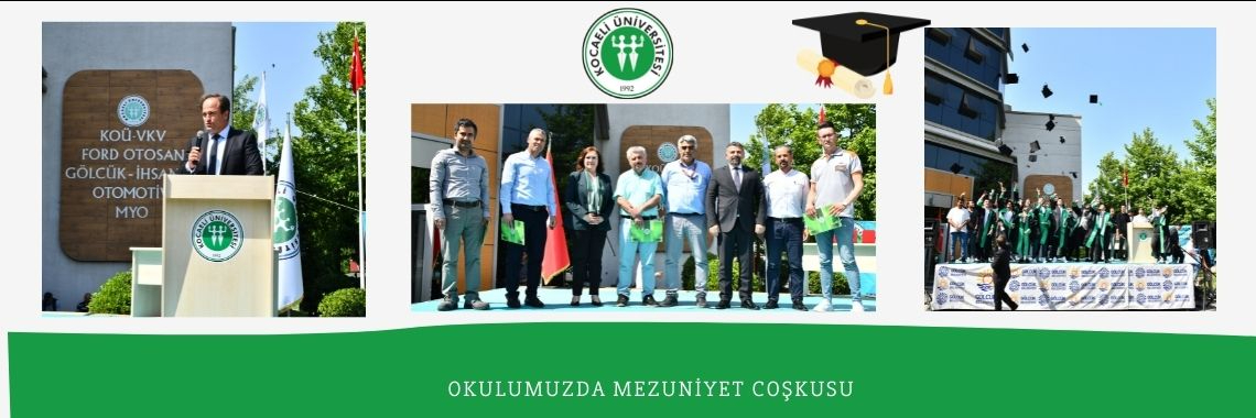 Okulumuzda Mezuniyet Coşkusu 2021-2022 Eğitim-Öğretim Yılı Mezuniyet Töreni Okulumuzda gerçekleştirildi. Tüm öğrencilerimize bundan sonraki hayatlarında başarılar dileriz. Kocaeli Üniversitesi Ford Otosan İhsaniye Otomotiv Meslek Yüksekokulu olarak 2021-2022 Akademik Yılı mezuniyet törenini gerçekleştirdik. Bu yıl 8. dönem mezunlarımızı uğurladığımız mezuniyet törenine Rektör Yardımcısı Prof. Dr. Nilgün Fığlalı, Gölcük Kaymakamı Cengiz Karabulut, Gölcük Belediye Başkanı Ali Yıldırım Sezer, Ford Otosan Fabrika Müdürü Aysan Hoşver, MYO Müdürümüz Doç. Dr. Abdulkadir Cengiz, Gölcük MYO Müdürü Dr. Öğr. Üyesi Fahrettin Öveç, Ford Otosan temsilcileri, akademik ve idari personel yanı sıra mezun öğrenciler ve aileleri katıldı. Saygı duruşunda bulunulması ve İstiklal Marşı'nın okunması ile başlayan törenin açılış konuşmalarında Rektör Yardımcısı Prof. Dr. Nilgün Fığlalı, Gölcük Kaymakamı Cengiz Karabulut, Gölcük Belediye Başkanı Ali Yıldırım Sezer, Ford Otosan Fabrika Müdürü Aysan Hoşver ile MYO Müdürümüz Doç. Dr. Abdulkadir Cengiz mezun olan öğrencilere gelecek hedeflerinde başarılar dilediler. Öğrenciler adına ise Otomotiv Teknolojileri Programı Birincisi Esat Kerim Göksu teşekkür konuşmalarını gerçekleştirdi. Endüstriyel Kalıpçılık, Makine Resim ve Konstrüksiyon, Otomotiv Teknolojileri ile Otomotiv Gövde ve Yüzey İşlem Teknolojileri programlarından toplam 170 öğrencinin mezuniyet heyecanı yaşadığı törende, bölümlerinde dereceye giren öğrencilere plaketlerini protokol üyeleri takdim etti. Tören, öğrencilerin birlikte kep atması ile sona erdi.